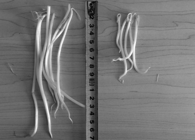 “黑作坊”制售的豆芽(左)和超市銷售的豆芽(右)長度形成鮮明對比。
