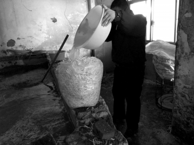 工人隨即進入作坊旁一間屋內(nèi),該屋南北兩側(cè)是一排用水泥砌成的池子,池內(nèi)放有不少塑料袋和叉子、鏟子等工具。工人在池中取出一個白色袋子,并從袋中盛出兩勺粉末。工人告訴記者,屋內(nèi)各塑料袋裝有不同的藥劑,他剛盛出來的是連二亞硫酸鈉粉末。“把這東西溶進水后,再漂洗豆芽就變白凈了。”該工人稱,他們進連二亞硫酸鈉時直接進一大桶,“這樣進貨便宜,而且能用好久”。