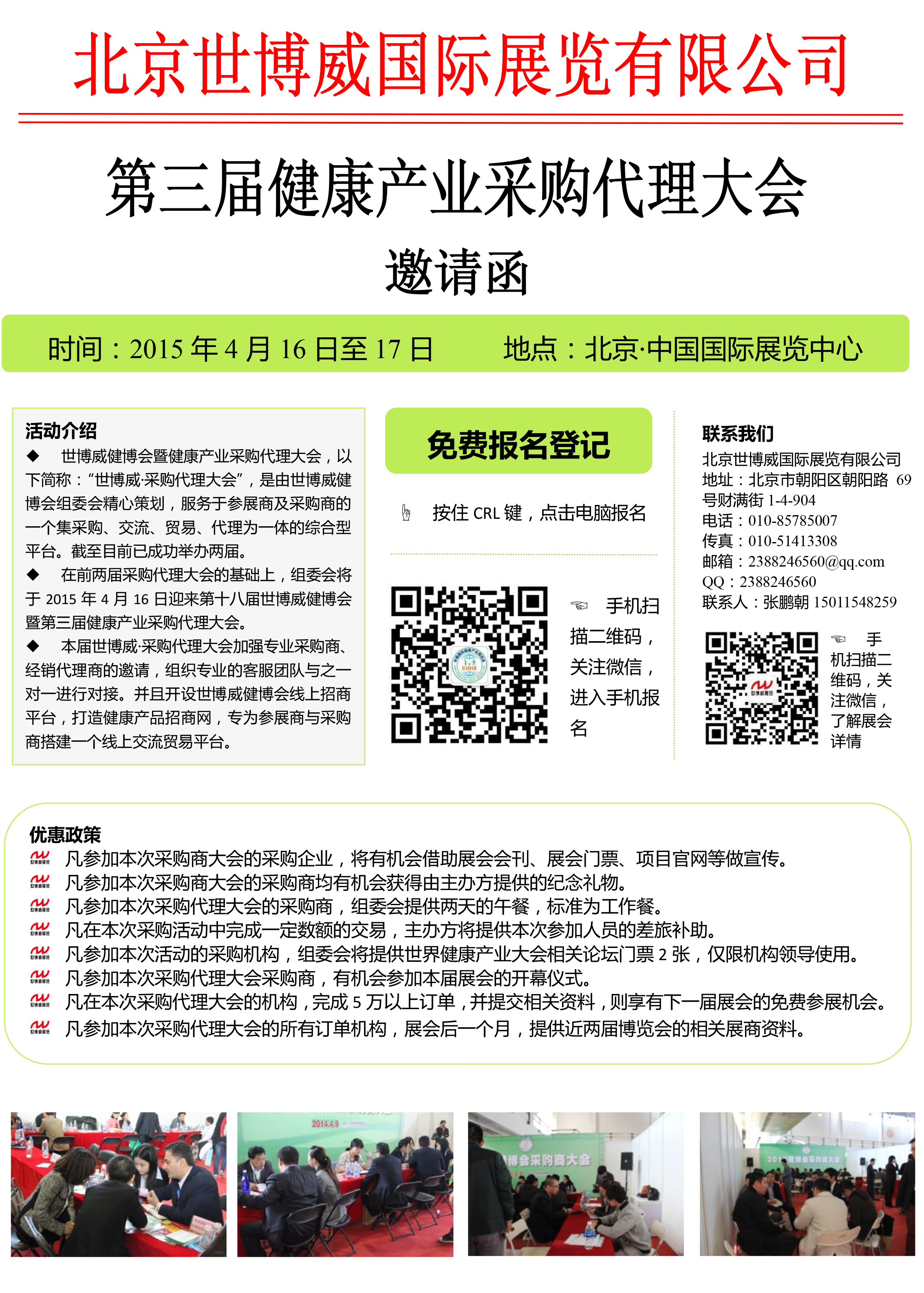 在前兩屆采購代理大會的基礎(chǔ)上,組委會將于2015年4月16日迎來第十八屆世博威健博會暨第三屆健康產(chǎn)業(yè)采購代理大會。本次大會在吸取往屆活動的成功經(jīng)驗,彌補不足之處,精確分析參展商需求,使活動精準到每一家參展商提供的產(chǎn)品,以及采購代理商所需產(chǎn)品。同時,本屆世博威·采購代理大會加強專業(yè)采購商、經(jīng)銷代理商的邀請,組織專業(yè)的客服團隊與之一對一進行對接。并且開設(shè)世博威健博會線上招商平臺,打造健康產(chǎn)品招商網(wǎng),專為參展商與采購商搭建一個線上交流貿(mào)易平臺。