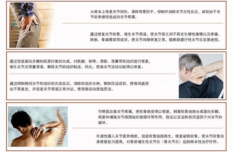 1.提供墊襯作用,緩和沖擊和摩擦。將水分吸入蛋白多糖分子內,使軟骨變厚如海綿般,增加關節(jié)內的滑液量。 2.把氧和營養(yǎng)素輸送至關節(jié),清除關節(jié)內廢物,改善疼痛、水腫等癥狀;增加關節(jié)靈活性,延緩病情進展。 |